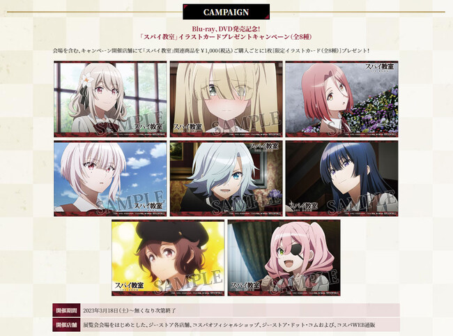 展覧会会場を含む、キャンペーン開催店舗にて『スパイ教室』関連商品を¥1,000(税込)ご購入ごとに1枚【限定イラストカード(全8種)】プレゼントいたします。