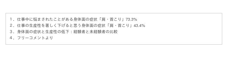 仕事中に悩んだことがある身体の症状「肩・首こり」:73.3%~しゅふJOB総研調査~