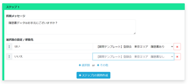 分岐テンプレート機能を使うことで応募者の回答内容に合わせてテンプレートを使い分けることが可能になります。例えば履歴書職歴書を持っている応募者には書類アップロード付きの質問テンプレート、持っていない応募者には入力欄付のテンプレートに誘導することで入力の負担を軽減することが出来ます。また希望勤務地や希望職種、経験の有無などによって質問内容が異なる場合に分岐機能を使うことで応募者に適した面接を行うことが可能になります。