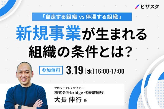 「知見と、挑戦をつなぐ」をミッションにグローバルなナレッジプラットフォームを運営する株式会社ビザスク(以下、当社)は、「『自走する組織 vs 停滞する組織』新規事業が生まれる組織の条件とは?」をテーマに、株式会社bridge の代表取締役の 大長 伸行 氏 ご登壇による無料オンラインセミナーを 3/19 (水) 16:00より開催します。