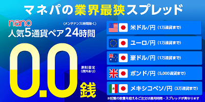 マネーパートナーズの「パートナーズFXnano」では、FX業界初の取り組み(※)として2022年11月16日より、5通貨ペアのスプレッドを一定数量まで業界最狭の24時間『0.0銭』でご提供しております。原則固定(例外あり)