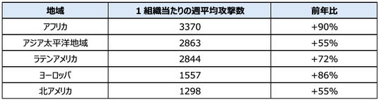 地域別で見ると、アフリカがサイバー脅威の矢面に立たされ、1組織当たり週平均3,370件の攻撃に直面して前年比90%増となりました。ヨーロッパ地域とラテンアメリカ地域でも攻撃の頻度が大幅に増加しており、世界的なサイバー犯罪者の敵意の高まりに無関係の地域などないことを示しています。