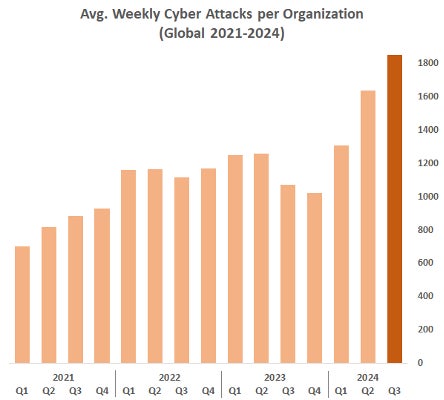 2024年第3四半期、1組織当たりのサイバー攻撃数は平均で1,876件という過去最高件数を記録し、2023年同時期と比べて75%増、前四半期(2024年第2四半期)比では15%増という驚異的な上昇を示しました。この急増は、バーチャルの脅威がより頻繁に、そしてより巧妙なものになっているという傾向を浮き彫りにしています。