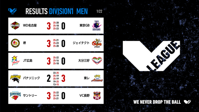 バレーボール国内最高峰リーグ V.LEAGUE【1月22日の試合結果】