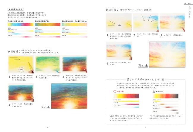 あざやかな、あるいは重厚な色彩を表現するには、実はテクニックがあります。あなたも自由にグラデーションをあやつってみましょう。それぞれのグラデーションでつかう色鉛筆もていねいに紹介します。