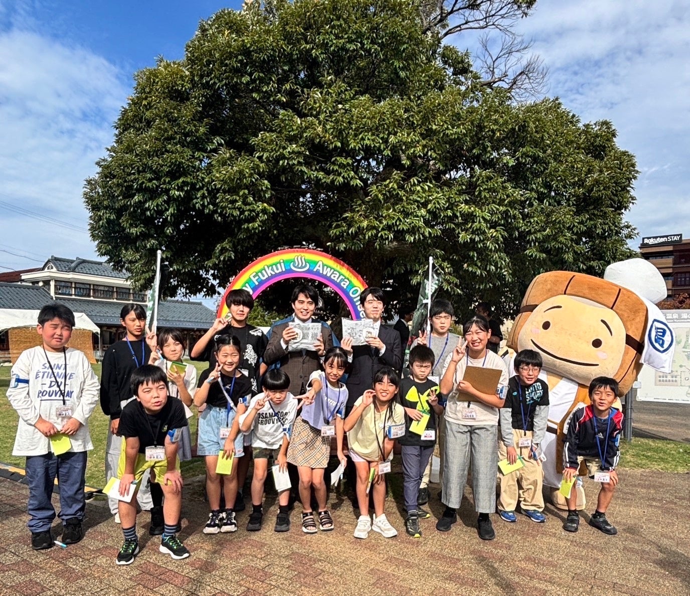 藤井聡太竜王と、佐々木勇気八段が、あわら温泉湯のまち広場で、地元の子どもたちの取材を受けました。