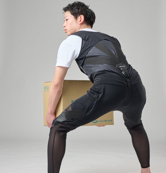 軽量性と柔軟性を兼ね備えたアシストスーツです。背部から大腿部にかけて高反発のゴムを配置し、ゴムの張力で持ち上げ動作に必要な腰や背部の負担を軽減します。また、身体への接触面が少なく、長時間の使用でも蒸れにくい設計になっています。