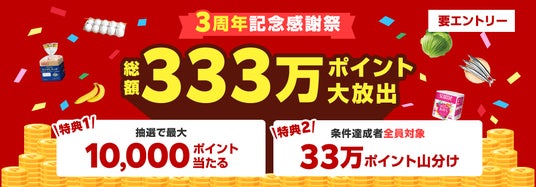 「ベイシアネットスーパー」が出店する「楽天全国スーパー」では、サービス開始3周年を記念して、最大10,000ポイントが当たるキャンペーンを開催中です。買えば買うほど、抽選の当選確率と当選ポイント数がアップします。さらに、期間中に「楽天全国スーパー」でお買い物したユーザーを対象に、33万ポイントを山分けするキャンペーンも開催しています。