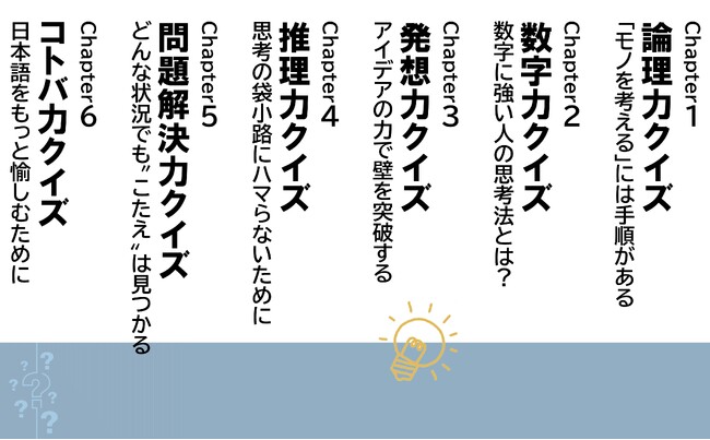 本書には、その解く力が身につく論理力、数字力、発想力、推理力、問題解決力、コトバ力――の6つのチカラを盛り込んだ問題を満載しました。