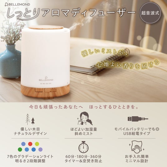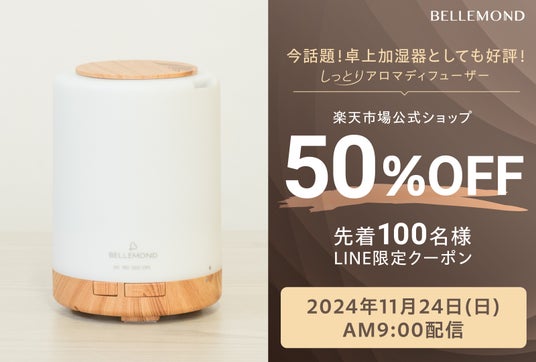 先着100名様限定!BELLEMOND公式LINE登録(11月23日までに登録必須)で、卓上加湿器としても使える「しっとりアロマディフューザー」が50%OFF!楽天市場公式ストアでお得にゲット!