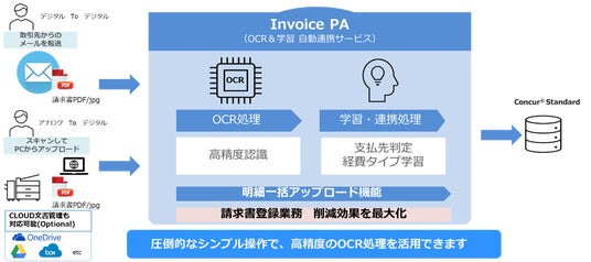 「Invoice PA」は、請求書を複合機などでスキャンするだけで、画像・文字認識AIエンジン(AI-OCR) と自動登録プログラムが連携し、Concur Standardに請求書データを自動登録する当社の独自ソリュ ーションです。ユーザーが請求書の情報を手作業で登録する工程を省き、デジタル化を促進し、繁忙期の煩雑な請求書処理業務を格段に効率化します。