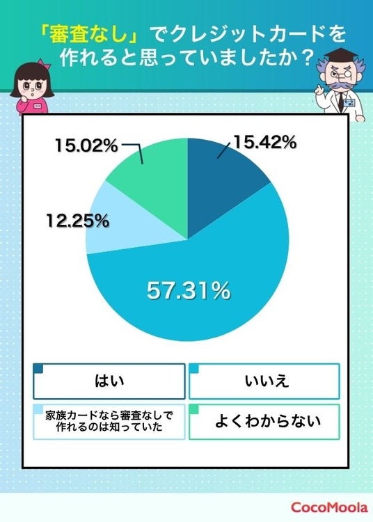 - 「審査なしでクレジットカードを作れると思っていた」人は15%。「家族カードなら審査がないと知っていた」人は12%。家族カードの仕組みへの認知はまだ限定的。