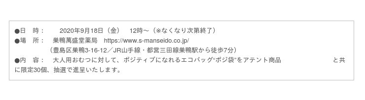 このたび、「第1回 常識をはきかえよう調査」として、大人用おむつについての意識 調査を行ったところ、60歳以上の46.0%が「大人用おむつは恥ずかしい」と思っていることが判明しました。そこで、ブランドキャンペーン第2弾として、よりポジティブな気持ちでアテントをご利用いただけるように、また、7月よりレジ袋が有料化されたことに伴いエコバッグの需要が高まっている社会的背景を踏まえ、敬老の日(9月21日)に向けた9月18日(金)12時より、巣鴨萬盛堂薬局にて、大人用おむつに対してポジティブになれるオリジナルエコバッグ“ポジ袋”及び「アテント 下着爽快プラス超うす型パンツ」を来店者を対象に抽選で30名様に進呈いたします。