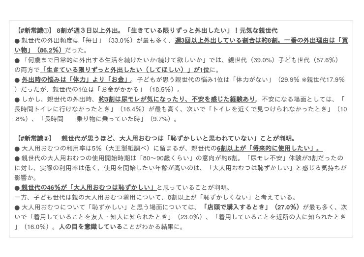 今回、「常識をはきかえよう調査」として、全国の60歳以上の男女200名(親世代)と、親と同居している30歳~59歳の男女200名(子ども世代)に、大人用おむつの使用や印象、親世代の外出の実態について調査を行いました。主な調査結果は以下のとおりです。