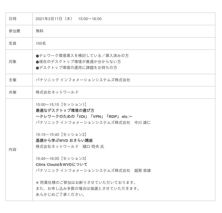 パナソニック インフォメーションシステムズ株式会社は、2021年3月11日(木)に「テレワークを支えるデスクトップ環境の最適解」にフォーカスしたオンラインセミナーを開催します。