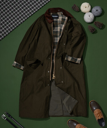 乗馬用のロングレングスコートとして開発された「BURGHLEY」をベースにしたモデル。可動域の広いラグランスリーブや、肩廻りや身幅に適度にゆとりを持たせ、全体的にオーバーサイズにモディファイ。