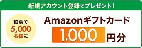 新規アカウント登録で、抽選で5,000名様にAmazonギフトカード1,000円分をプレゼントいたします。