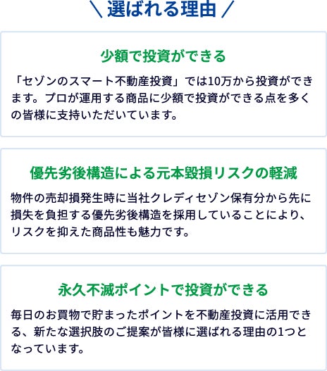 そのような声にお応えし、「セゾンのスマート不動産投資」に関するアンケート結果を基に、アカウント登録をされたお客様が魅力に感じられたポイントTOP3をご紹介します!
