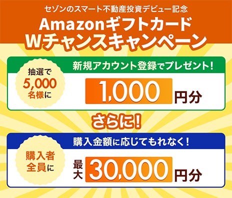 新規アカウント登録で、抽選で5,000名様にAmazonギフトカード1,000円分をプレゼント、さらに購入金額に応じてもれなくAmazonギフトカード最大30,000円分をプレゼント!
