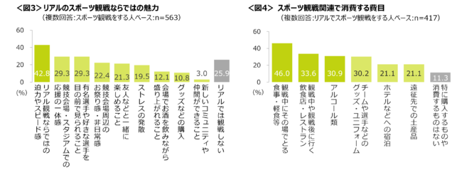 「競技会場・スタジアムでの応援の一体感」「有名選手や好きな選手を目の前で見られること」が3割で続く。<図3>