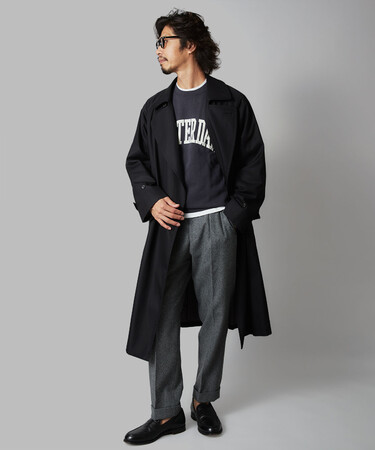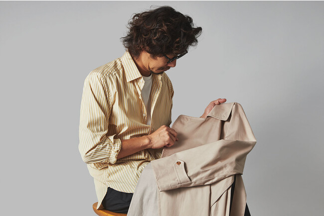 「コートを“着込む”というより、無造作に“羽織る”感覚で着られるのがタイロッケンコートの魅力。 ボタンがないぶん、トレンチよりもすっきりと軽快な印象になるんです。 とはいえヴィンテージそのままだと、やはりクセが強く合わせにくい。 そこで胸周りの芯地を省いて軽快感を高めたり、首ぐりをコンパクトにして襟周りのバランスを調整したりと細部をアップデートしました。 国内有数の実力派コートファクトリーに生産を依頼することで、テーラードコートのような本格仕立てに仕上げられているのもポイントです」(四方さん)