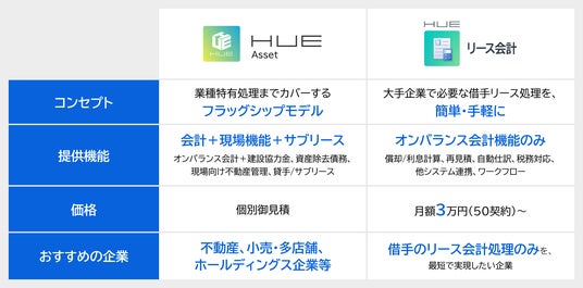 新たに提供を開始する「HUEリース会計」は、「HUE Asset」で培ったノウハウをもとに、業種や業態を問わず必要な機能だけを厳選して開発した、より手軽に導入できるシステムです。月額3万円からの契約件数に応じた利用料で導入が可能となるため、リース契約件数や現場の運用体制、サブリース対応の必要性が限られている企業でも、より自社に最適なシステムを選択できるようになります。