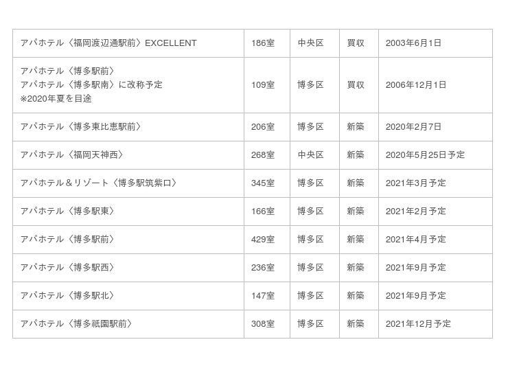 福岡市内においては、現在、アパホテル〈福岡渡辺通駅前〉EXCELLENT(186室)、アパホテル〈博多駅前〉(※2020年夏に「アパホテル〈博多駅南〉」に改称予定)(109室)、アパホテル〈博多東比恵駅前〉(206室)の3ホテル・501室が営業中であり、2020年には、アパホテル〈福岡天神西〉(268室)の1ホテル・268室が開業予定、2021年には本日起工式を迎えるアパホテル〈博多駅西〉(236室)、アパホテル〈博多駅北〉(147室)のほか、アパホテル&リゾート〈博多駅筑紫口〉(345室)、アパホテル〈博多駅東〉(166室)、アパホテル〈博多駅前〉(429室)、アパホテル〈博多祇園駅前〉(308室)の6ホテル・1,631室が開業予定であり、福岡市内では全10ホテル・総客室数2,400室となる。特に、「博多駅」周辺エリアにおいては、7ホテル・1,740室体制となる集中出店(ドミナント)戦略を図っている。