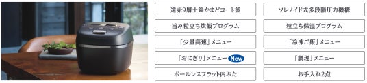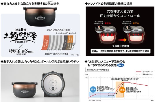この度発売する「土鍋ご泡火炊き JRX-S100/S060」では、一昨年のIHコイルの全面改良、昨年の土鍋の進化を経て、WレイヤーIHと土鍋をより精度よくコントロールする「匠火センサー」を採用いたしました。進化を遂げたIHコイル「300℃ WレイヤーIH」や土鍋の素材力のみならず、絶妙な火かげんでごはんを炊きあげる職人技を実現します。また事前に6時間冷蔵庫で吸水させるこだわりの「極・低温吸水」メニュー、土鍋ごはんで炊いたおにぎりの「粒感があり、ほどけるような食感」を目指した「おにぎり」メニューを新搭載。従来より搭載している「70銘柄巧み炊きわけ」や「一合料亭炊き」など、充実した炊きわけ機能で、奥深いごはんの楽しみ方の幅を広げます。