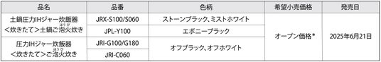 また、お客様のニーズにお応えしコンパクトサイズ(3.5合炊き)の「ご泡火炊き JRI-C060」を新投入いたします。JRI-G型のごはんの“おいしさ”を支える高い機能性と便利な“お手入れ性”はそのままに、日本国内で増加する小世帯家族にちょうど良いサイズとして人気モデルのラインアップを拡充いたします。