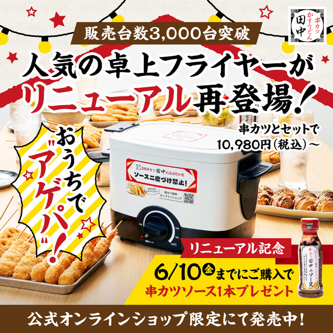 株式会社串カツ田中(本社:東京都品川区東五反田、代表取締役社長:貫 啓二、以下:串カツ田中)が運営するオンラインショップ『串カツ田中オンラインショップ』では、2022年6月1日(水)よりリニューアルした『卓上フライヤー(山善製)』を販売いたします。