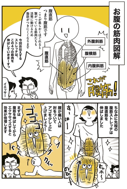 簡単にできるストレッチ方法とともに伸ばしている筋肉、縮んでいる筋肉を詳しく解説。