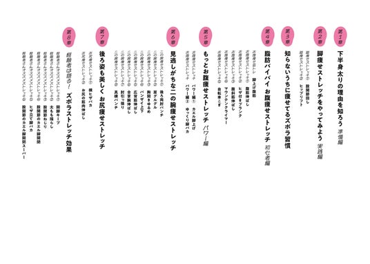 第1章~第8章まで身体の部分ごとにおすすめのストレッチが掲載されているので、悩みのある部分を中心に実践できる構成になっています。