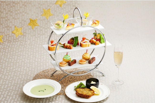 「フォンテーヌ」では、天の川をイメージしたフィンガーフードスタイルの彩り豊かなメニューを盛り合わせたハイティーをご用意しました。キッシュやサテ、鱧のフリットなど、どれもシャンパンやワインとの相性も抜群。