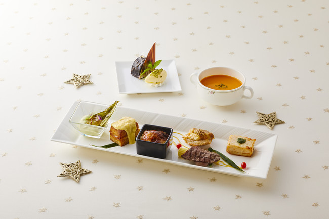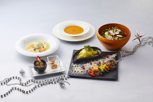 また、ディナータイムは、前菜、スープに続き、彩り豊かなサラダメランジェをご提供。メインディッシュには、洋の中に和の味わいも感じる「鱧とナスのラビオリ トマトソース」と豪快なBBQスタイルでご提供する「牛サーロインと鶏肉のコンフィ、厚切りベーコンのブロシェット仕立て」の2種を天の川スタイルで豪華に盛り付けました。ロビーシャンデリアの「天の川」を眺めながら、食材の旨みを引き出したシェフのコースメニューをお楽しみください。