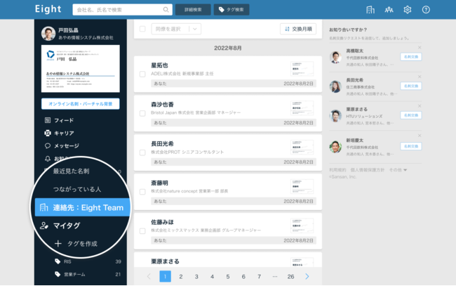 Eight Teamは、個々人が持つ名刺情報をチーム内で共有できるようにすることで、業務効率化や営業機会の創出を後押ししています。これまで2000社以上に利用されており、企業・団体等に限らず、部署やプロジェクトをはじめとするチーム単位での名刺情報の共有を可能にします。