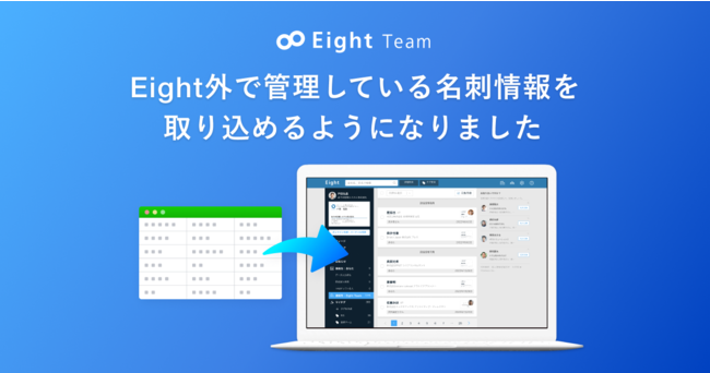 Sansan株式会社は、キャリアプロフィール「Eight」の中小企業向け名刺管理サービス「Eight Team」において、Eight外で管理していた名刺情報の取り込みを可能にする機能を開発・搭載しました。これによりEight Teamに参加しているユーザーは、Excel等のデータファイルやEight以外の名刺管理サービスで管理していた名刺情報をユーザー自身のEightに一括で取り込み、チームで共有することが可能になります。