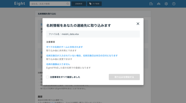名刺情報を入力したテンプレートファイルをEightにアップロードします。1回のアップロードで名刺1万枚までの情報を取り込むことができます。