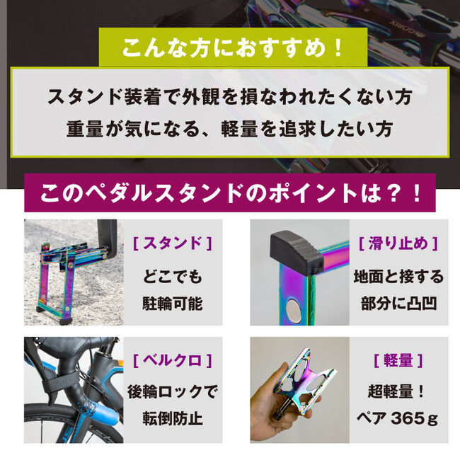 スタンド機能が付いている画期的な自転車ペダルです。壁や柱がない街中での駐輪も問題なく可能です。足元のペダルから個性的なカスタマイズを応援します。