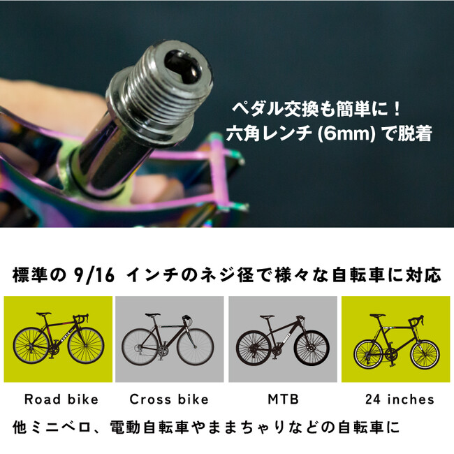 六角レンチ(6mm)で交換可能なのでペダルの取り付けも簡単に。
