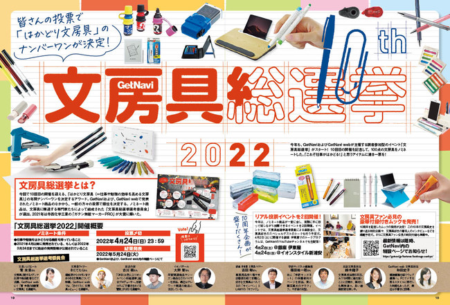 GetNavi、GetNavi webが主催する読者参加型のイベント「文房具総選挙」が今年もスタート。10回目の開催を記念して、8部門全100点の文房具をノミネートした。「これぞ作業がはかどる!」と思うアイテムに清き一票を!