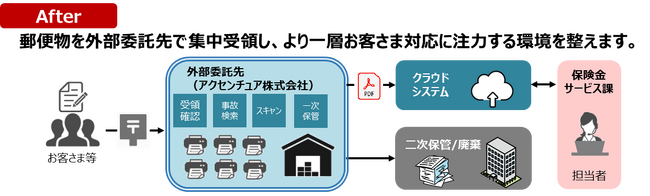 損保ジャパンは、お客さまの安心・安全・健康な暮らしを支える保険会社として、事故に遭われたお客さまを全力でサポートしています。より一層お客さま対応に注力するための環境整備として、このたび社外からの郵便物集中受領拠点(外部委託先:アクセンチュア株式会社)を設立することになりました。事務作業をアウトソースすることで、お客さま一人ひとりにご満足いただける事故対応の時間を創出することを目的としています。