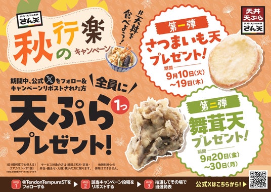 サトフードサービス株式会社(本社・大阪府大阪市、代表取締役社長・杉本 貴之)が運営する「天丼・天ぷら本舗 さん天 」では、2024年9月10日(火)~9月30日(月)まで、公式Xで行楽の秋キャンペーンを実施いたします。公式Xアカウントをフォローし、キャンペーン投稿をリポストすることで、第一弾の9月10日(火)~9月19日(木)までは揚げたてほくほくの「さつまいも天」を、第二弾の9月20日(金)~9月30日(月)までは「舞茸天」がその場でもらえるキャンペーンを期間限定で開催します。簡単に応募でき、期間中に何度でも揚げたてサクサクの天ぷらがもらえる大変お得なキャンペーンですので、ぜひご利用ください。