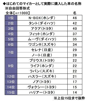 ◆はじめてのマイカーに選んだ車 1位「N-BOX」2位「タント」3位「アクア」