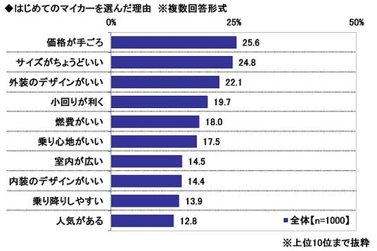 次に、はじめてのマイカーを選んだ理由を聞いたところ、1位「価格が手ごろ」(25.6%)、2位「サイズがちょうどいい」(24.8%)、3位「外装のデザインがいい」(22.1%)となりました。