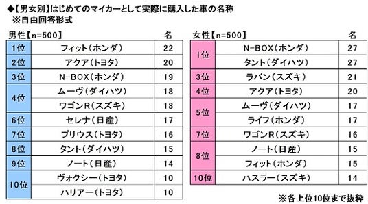 男性回答1位「フィット」、女性回答1位「N-BOX」「タント」