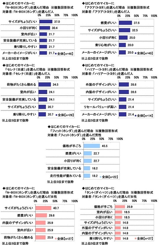 また、男女別にみると、男性1位の「フィット(ホンダ)」では「価格が手ごろ」(45.5%)、女性1位の「N-BOX(ホンダ)」では「サイズがちょうどいい」(40.7%)、「タント(ダイハツ)」では「価格が手ごろ」(25.9%)が最も多くなりました。