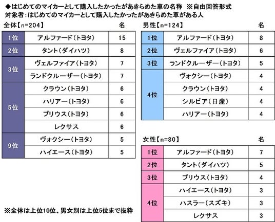 男女別にみると、男性では1位「アルファード(トヨタ)」(8名)、2位「ヴェルファイア(トヨタ)」(6名)、女性では1位「アルファード(トヨタ)」(7名)、2位「タント(ダイハツ)」(5名)となりました。