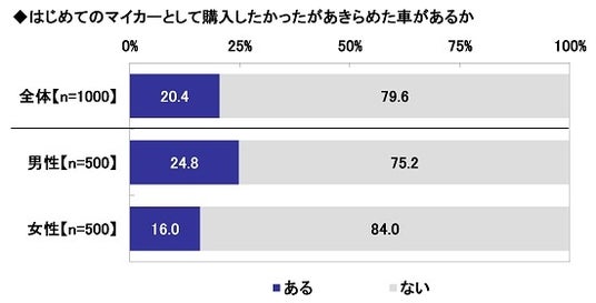 はじめてのマイカーとして購入したかったがあきらめた車があるかを聞いたところ、「ある」は20.4%、「ない」は79.6%となりました。