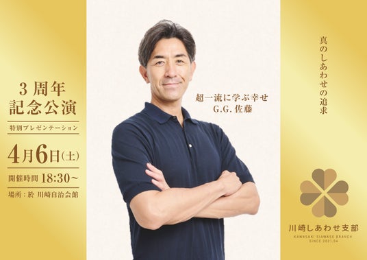 一般財団法人 日本プロスピーカー協会(以下、「JPSA」)の川崎しあわせ支部が設立3周年を迎え、4月6日に川崎市総合自治会館でリアルとオンラインのハイブリッド形式にて、講演会を開催いたします。講師として登壇するのは、プロ野球選手として活躍し、北京五輪野球日本代表にも選出されたG.G.佐藤氏。成功も失敗も経験したからこそ伝えられる「真のしあわせ」についてメッセージをいたします。