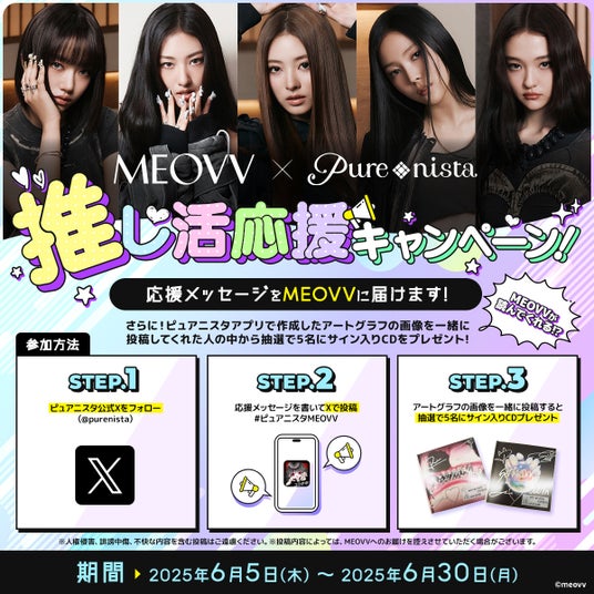 本コラボを記念し、X(旧Twitter)にて応援キャンペーンを実施します。期間中、指定のハッシュタグを付けて『MEOVV』への応援メッセージをご投稿いただくと、そのメッセージはスタッフを通じてメンバー本人に届けられます。さらに、応援メッセージとあわせて「アートグラフ」をご投稿いただいた方の中から、抽選で5名様にメンバー直筆サイン入りCDをプレゼントします。ファンの皆様の熱いメッセージとアートのご応募を、心よりお待ちしております。